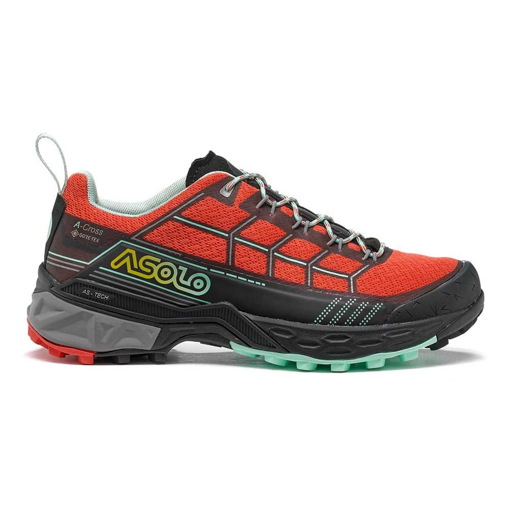 A polyester upper reinforced with TPU material offers protection and comfort while the Gore-Tex Extended Comfort Footwear lining guarantees waterproofness and breathability. The outsole package is made of a mono-density Eva midsole to assure stability, support, comfort and cushioning. The AS-Tech technology was designed and incorporated to give structure and torsion stability. The Asolo Cross outsole presents a self cleaning design and it assures the best traction and grip, thanks to the Sigma Grip compound, developed by Asolo. A TPU cap gives an additional protection, the thermoshaped tongue guarantees the best fit and the cordon lacing system assures a precise lace up.