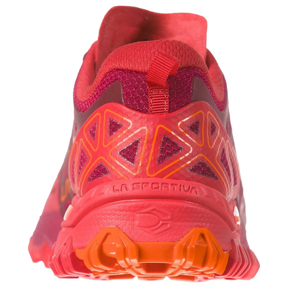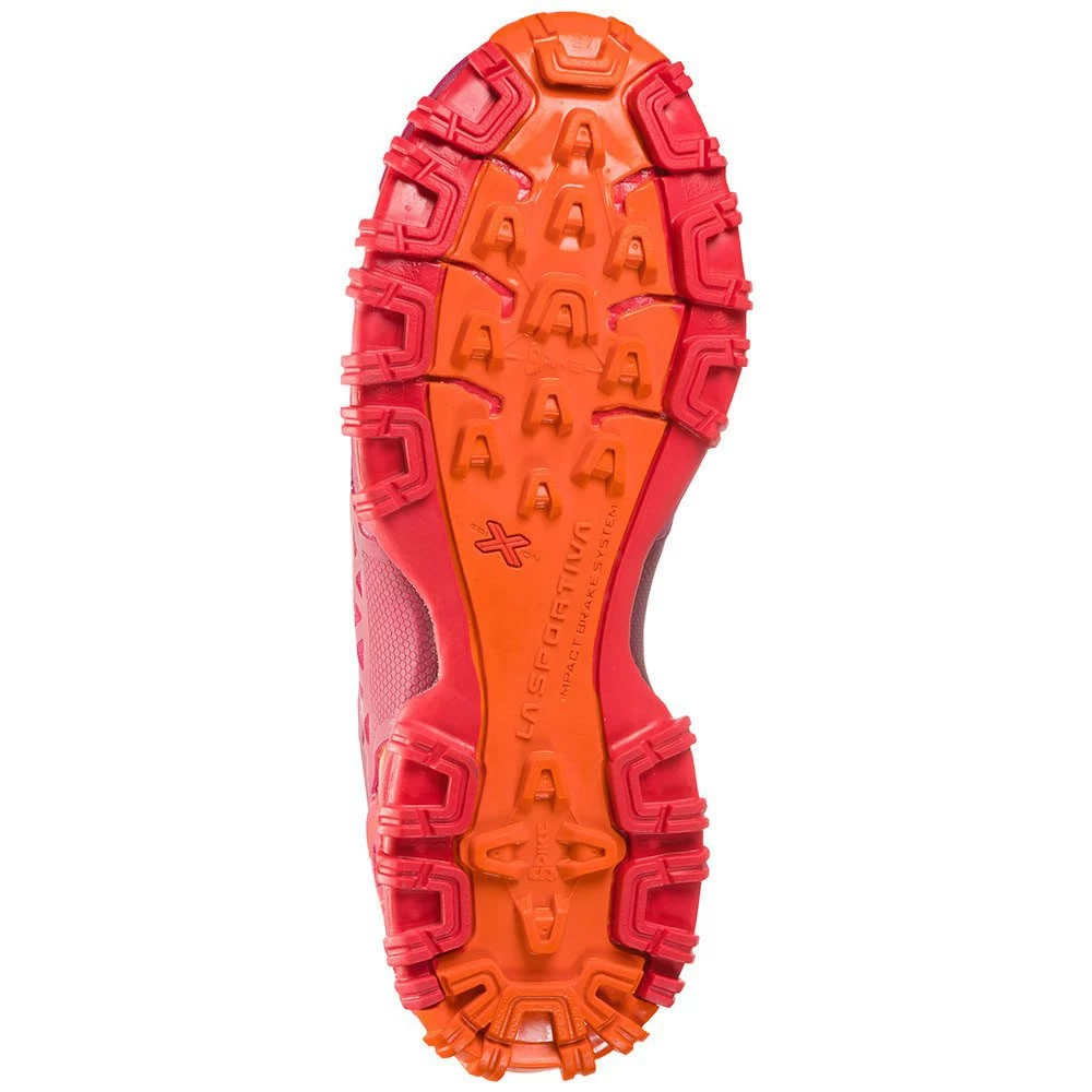 – The innovative system is applied to the sole to absorb negative ground impact, help traction and improve grip downhill: Created and developed by the R&D department at La Sportiva, it offers real advantages during racing by reducing negative ground impact. The unique position of the lugs allows as many of them as possible to come into contact with the ground, for maximum impact absorption.