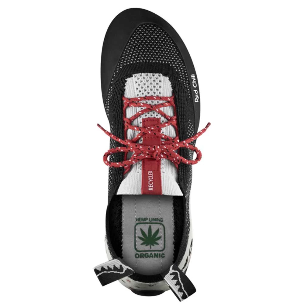 Climbing shoes produced using highly sustainable methods through recycling post-consumer polyester in line with the Global Recycled Standard (GRS).